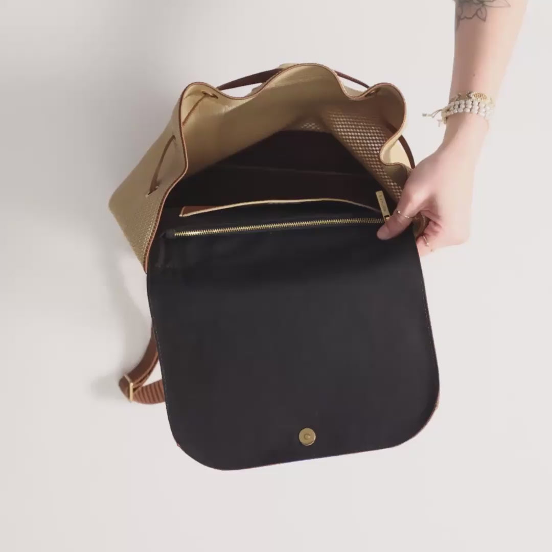 The Cinch Backpack in Brown Butter being packed with a camera, a water bottle, a tube of hand cream, a bottle of sunscreen, a book and a baseball cap. The model then unzips the interior pocket and puts a Wallet wristlet inside, along with an iPhone and a pair of sunglasses. The model cinches the drawstring closed and carries the bag out of frame.