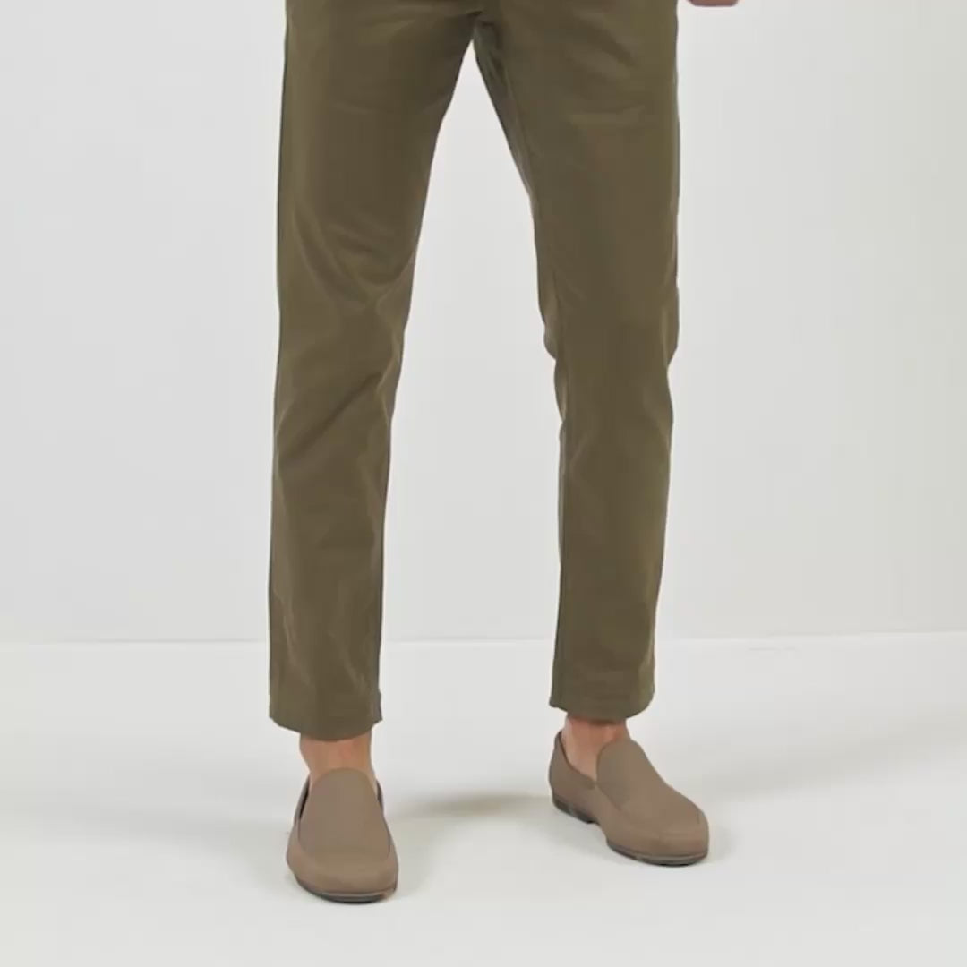 Model walking in The Ravello Loafer in Faded Brown and showing different angles of the shoes.