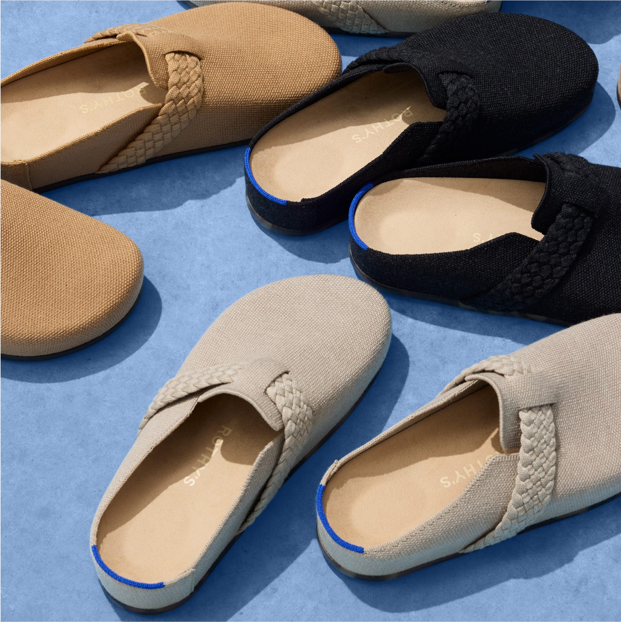 Overhead shot of The Braid Clog in multiple colors. Close up of the outsole of The Braid Clog. A model wearing The Braid Clog. Close up of the heel on The Braid Clog.