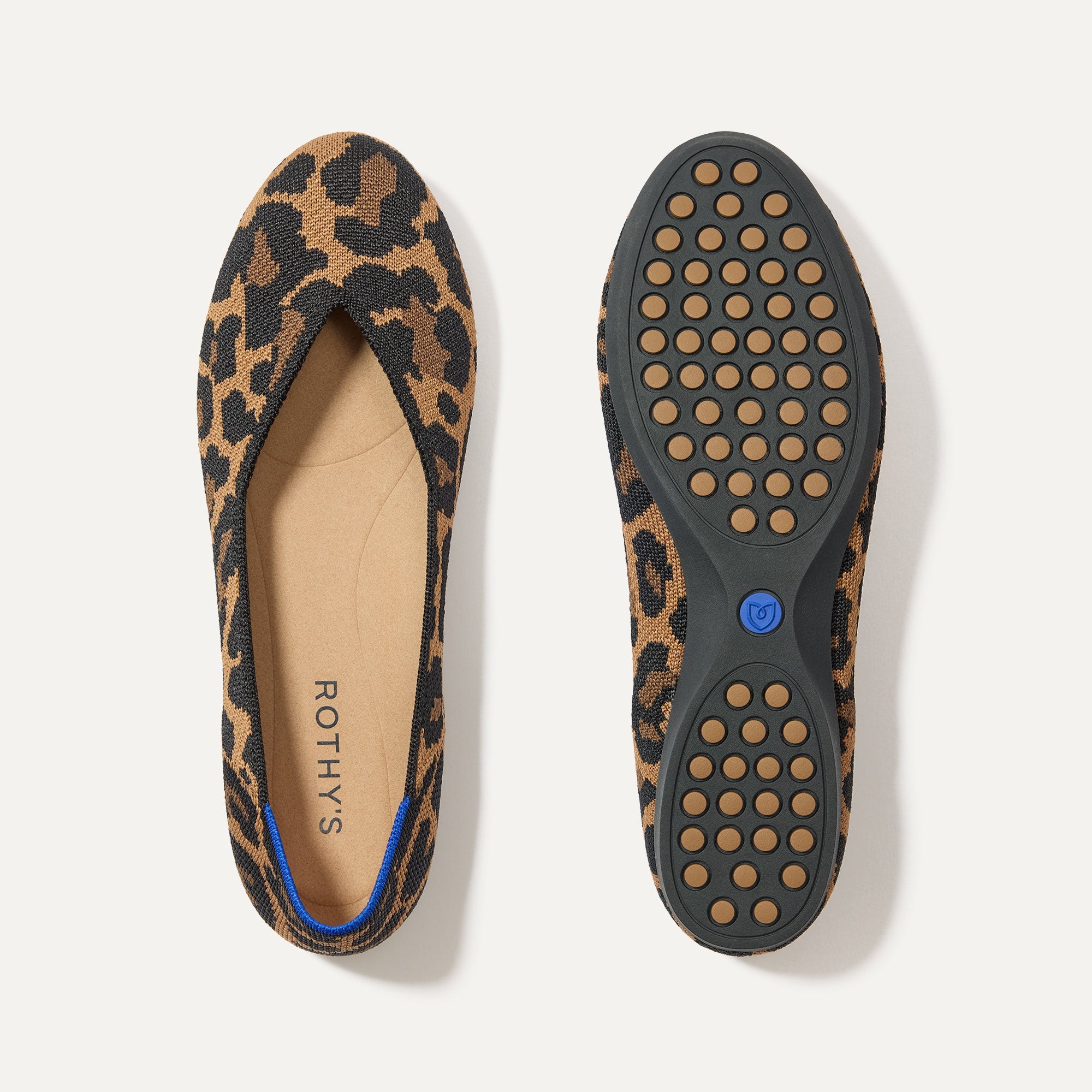 Woman wearing The Daily Flat in Cheetah and blue jeans and a black top on a plain background